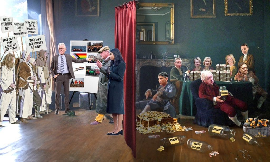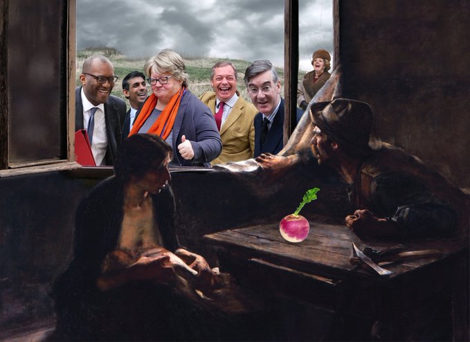With the “Sunlit Uplands” Brexit promise of the Tories failing so badly, Britain has yet to acknowledge it suffered a coup by an oligarchic, fossil-fuel-serving ruling, criminal class. Their lackeys are the graduates from upper-class public (private in the US) schools, who make up 74% of the current government or just 2% representation of the entire population. From a progressive forward-looking nation, the UK has devolved at dizzying speed into a nostalgic, backwards-falling country immersed in its mythic distortion of “greatness.” The reality is that Britain is now a glorified Petri dish for oligarchs to experiment with how far they can push a nation into hunger-games-type feudalism to maintain and grow their immense wealth and power.